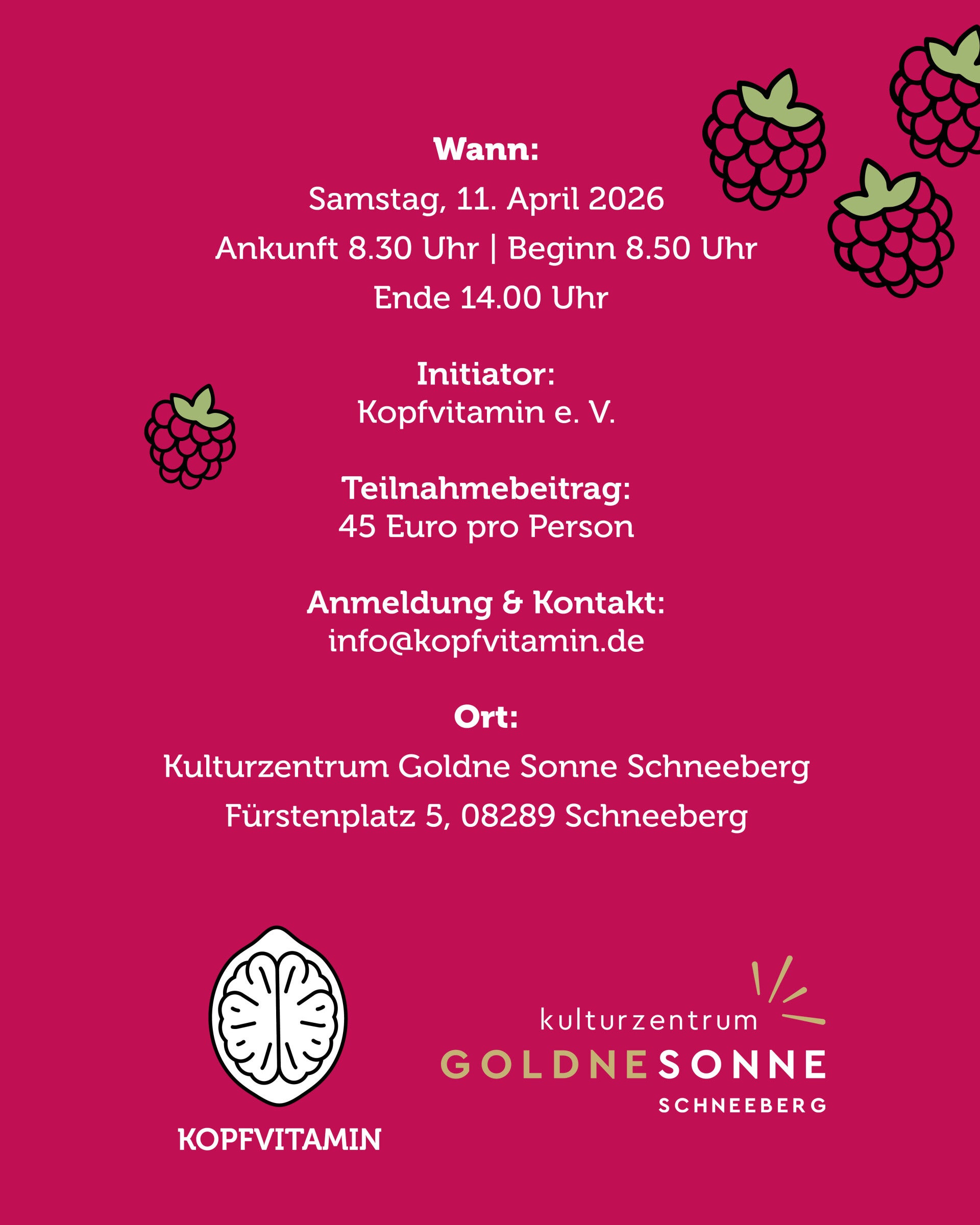 Mental Load – oder wenn der Kopf zu viele To Do’s bewältigen will… Wer kennt es nicht? Beruf, Familie, Partnerschaft, Hobbies, Sozialkontakte, Kindergeburtstage, Arzttermine, Rucksack packen für die Kita etc. … alles Herausforderungen, die den Alltag als Frau ins Wanken bringen können. Manchmal beginnt die Anspannung im Kopf, wenn viele Dinge auf einmal zu erledigen sind und der mentale „Overload“ dazu führt, dass keine Zeit für die eigenen Bedürfnisse gegeben ist. Dies kann dazu führen, dass Frauen zu wenig Ruhepausen haben, zu wenig Schlaf erhalten und dies zu Unausgeglichenheit bzw. Gereiztheit führen kann. Im Rahmen eines selbstfürsorglichen Tags zur psychischen Gesundheit bei Frauen werden Besonderheiten im Dasein als Mutter, Partnerin und Arbeitstätige beleuchtet und im Hinblick auf Möglichkeiten der Förderung einer gesunden Balance diskutiert. Neben Impulsen wird der Austausch im gemeinsamen Miteinander unter Frauen gefördert und zugleich sollen praktische Übungen (u.a. Yoga) dazu einladen, sich mit den eigenen Bedürfnissen zu beschäftigen und für den Moment ein wenig Ruhe und Gelassenheit zu erfahren. Das Kulturzentrum „Goldne Sonne“ in Schneeberg stellt die Räumlichkeiten zur Verfügung, um in einen gesunden, achtsamen und erkenntnisreichen Prozess rund um Selbstfindung, Selbstwirksamkeit und Umgang mit typischen Belastungen zu gelangen. Wir freuen uns Euch zu begrüßen und Euch an diesem 11. April 2026 zu vermitteln, dass Ihr wichtig seid Euer Tun wertvoll ist. Anmeldungen können ab sofort vorgenommen werden. Es können auch Gutscheine zur Veranstaltung (bspw. zu Weihnachten, Geburtstagen oder einfach so) gekauft und verschenkt werden. #frauengesundheit #resilienz #kopfvitamin Design: Anne Krauß